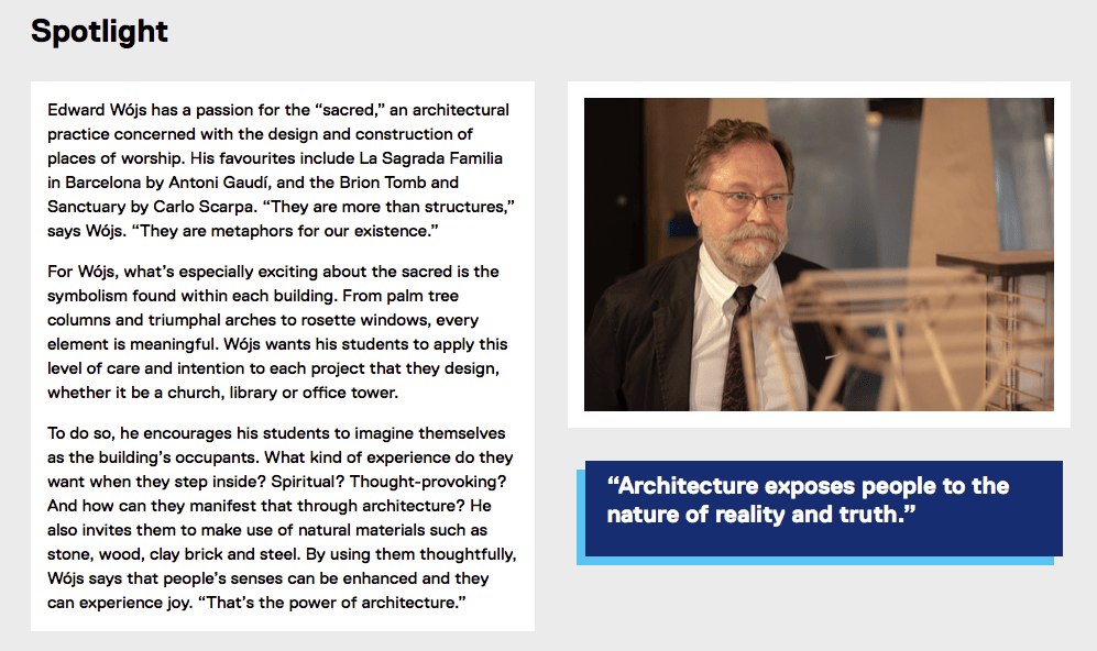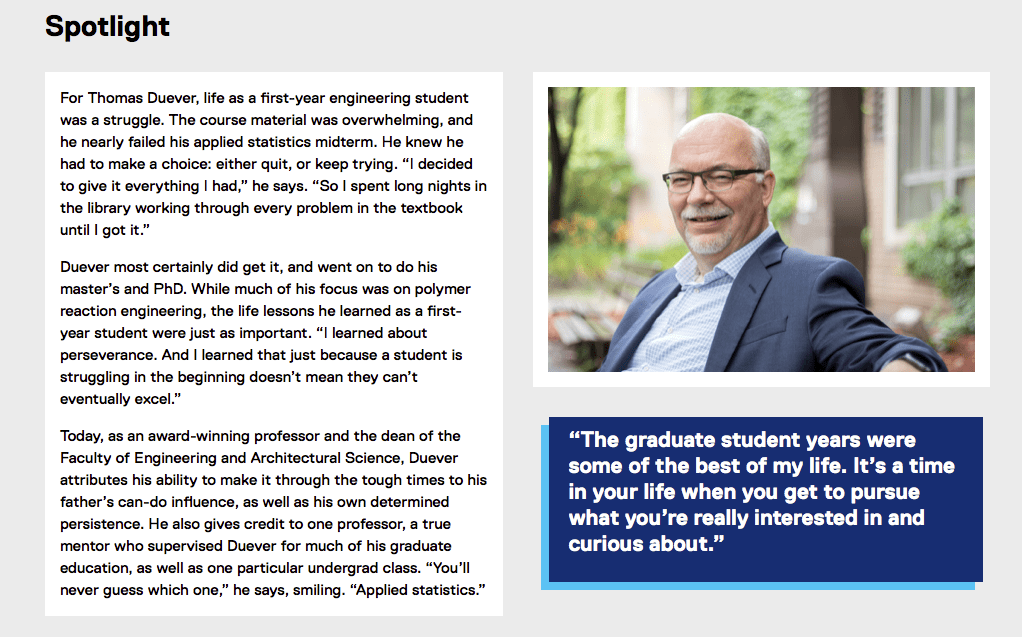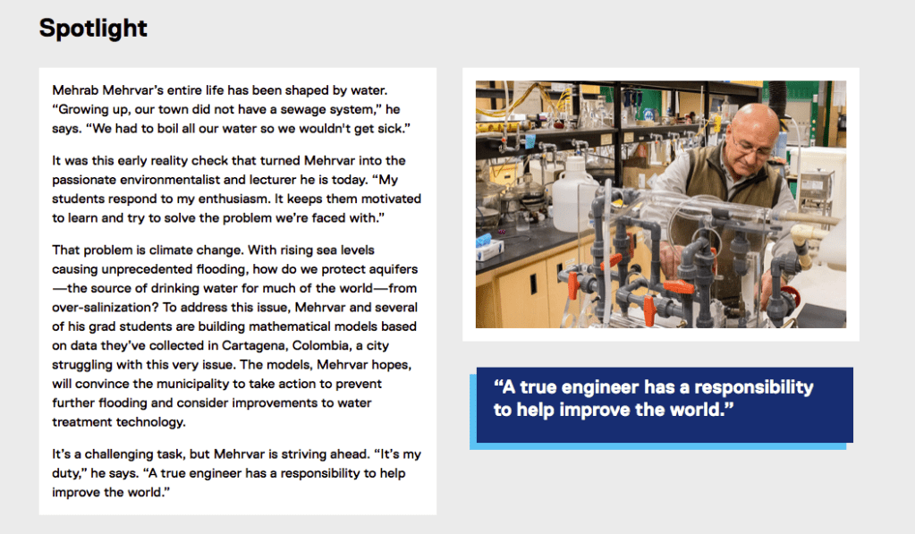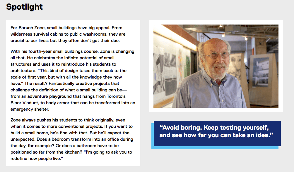 I performed 65+ interviews with professors from TMU’s Faculty of Engineering and Architectural Science and distilled their research and teaching philosophies into easy-to-understand profiles. Examples…