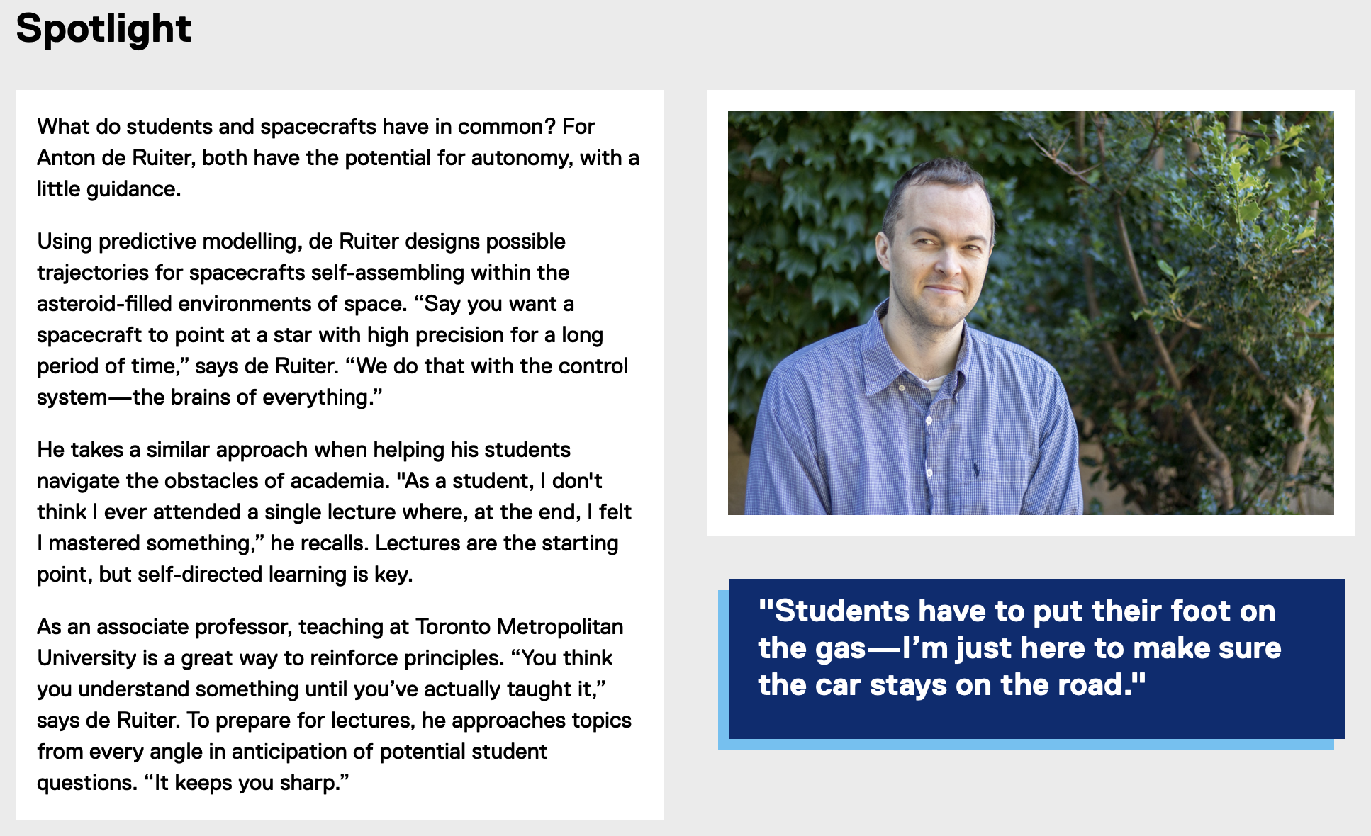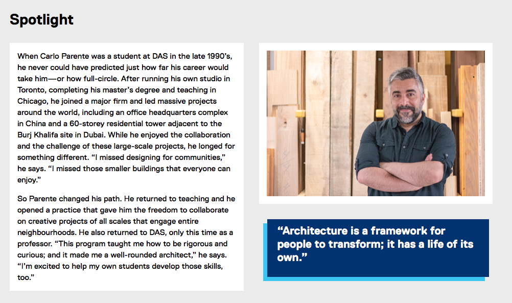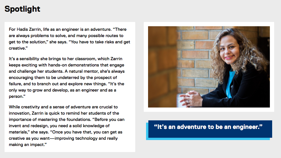 I performed 65+ interviews with professors from TMU’s Faculty of Engineering and Architectural Science and distilled their research and teaching philosophies into easy-to-understand profiles. Examples…